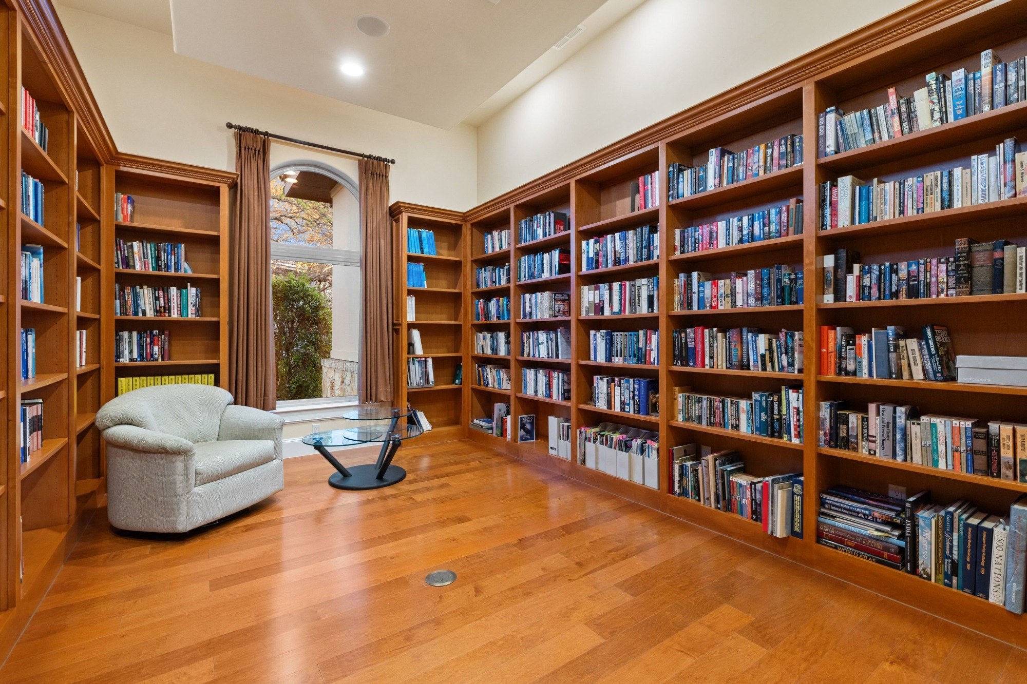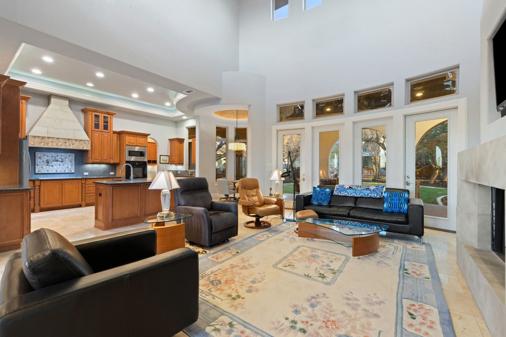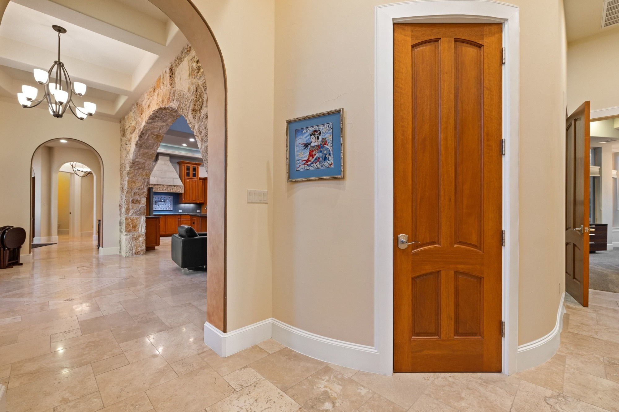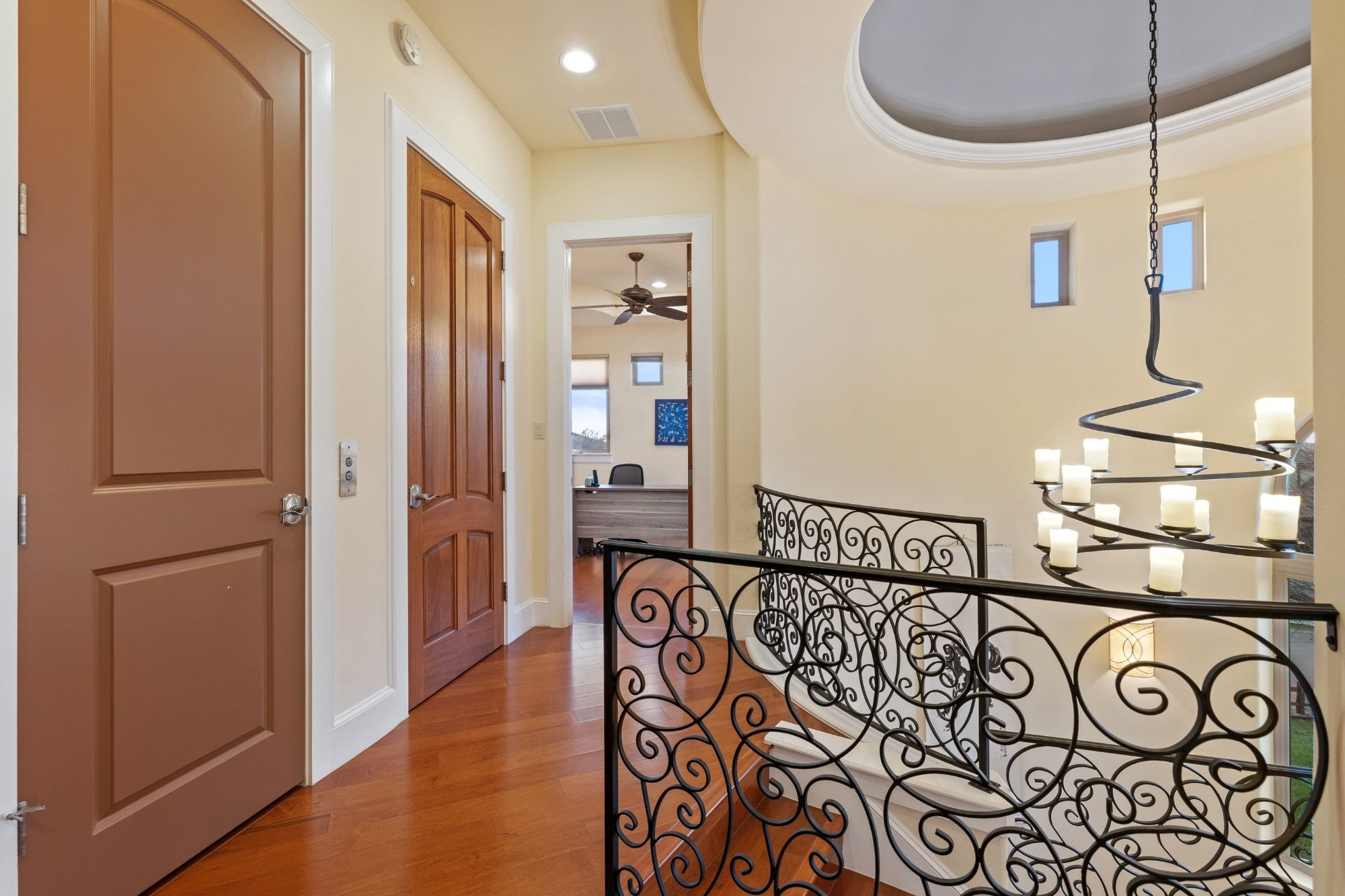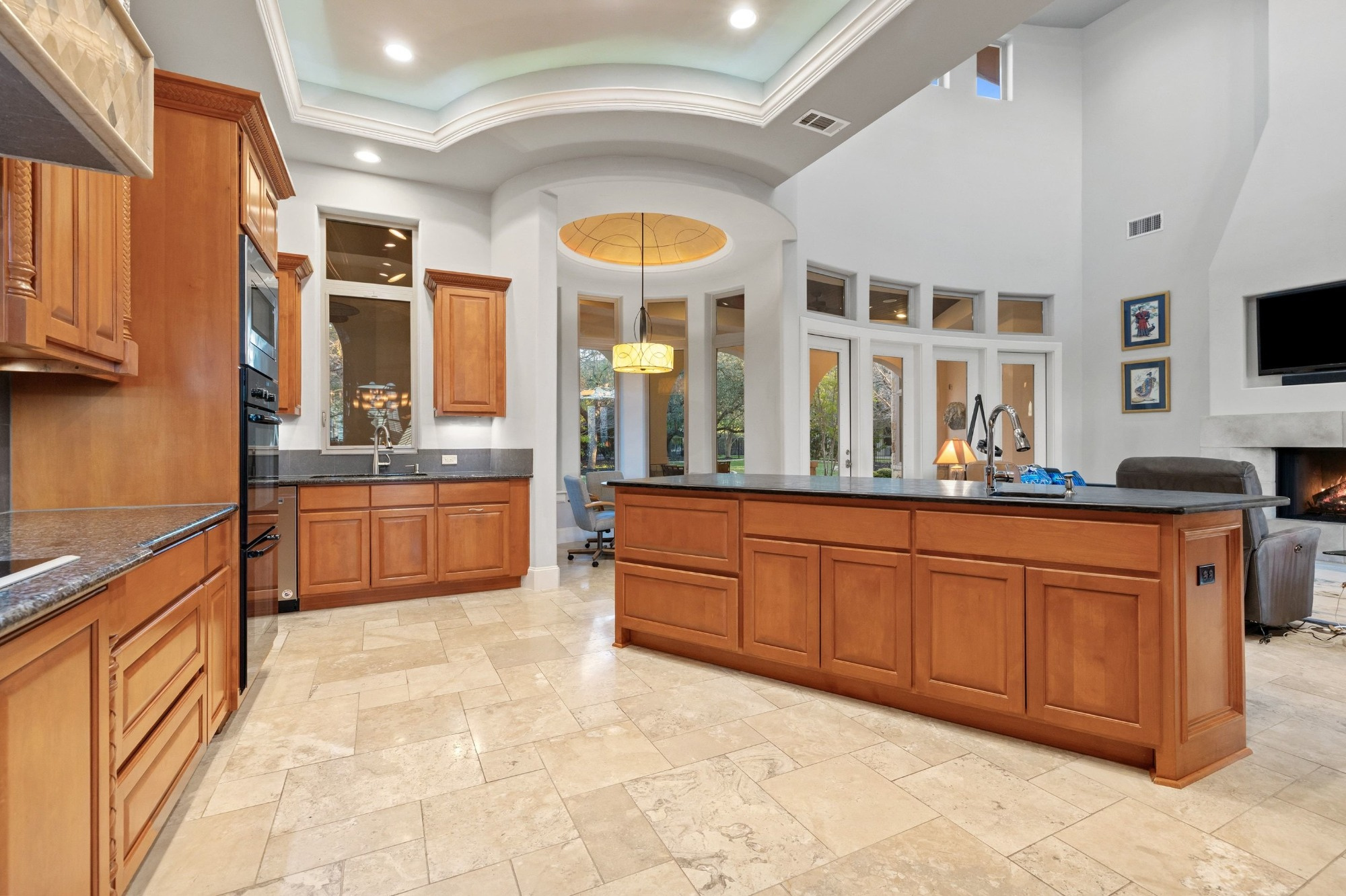 Welcome home to Mediterranean-style living at the lake. Designed by Vanguard Studios and built by Masters Touch Builders in 2012, this stone and stucco home features approximately 80 tons of stone, a Mexican concrete tile roof, and a charming courtyard with fountain. The 4,797± sq. ft. residence sits on a beautifully landscaped 0.497-acre wooded lot and offers 5 beds, 4 full baths, and 2 half baths. The main level includes a library, dining room, spacious kitchen with large pantry, breakfast area, living room with fireplace, primary suite, guest suite and laundry room. The kitchen features a tray ceiling with crown molding, recessed lighting, a 9’ x 4’ granite island with vegetable sink, granite countertops, stained wood cabinetry with deep drawers, pull-out spice racks, and specialty storage. Appliances include an LG French door refrigerator, Bosch electric cooktop, microwave, double ovens, and a Whirlpool dishwasher. The library is prewired to convert to a media room. The primary suite features a coffered ceiling, patio access, and a turret-style sitting area with domed ceiling and tall windows overlooking the rose garden. The primary bath includes a walk-in tiled shower with seating, dual vanities, air jet tub, and private commode. Upstairs, accessible by a spiral staircase or the elevator, are three additional bedrooms and a lofted party room overlooking the living room. One bedroom has an en-suite bath while two share a full bath, with lake views from many rooms including the balcony. The landscaped grounds feature towering live oaks, flowering trees, rose bushes, and space for a future pool. An all-copper lightning protection system and whole house surge protector system was installed by Hamilton Lightning Rods in April 2023.