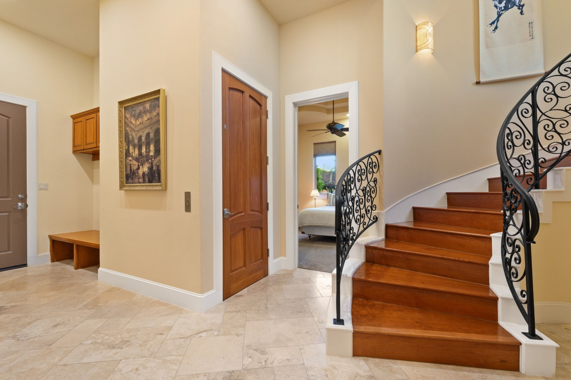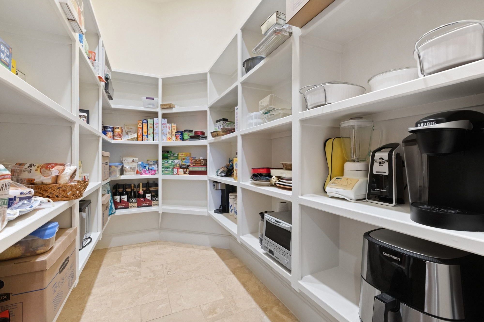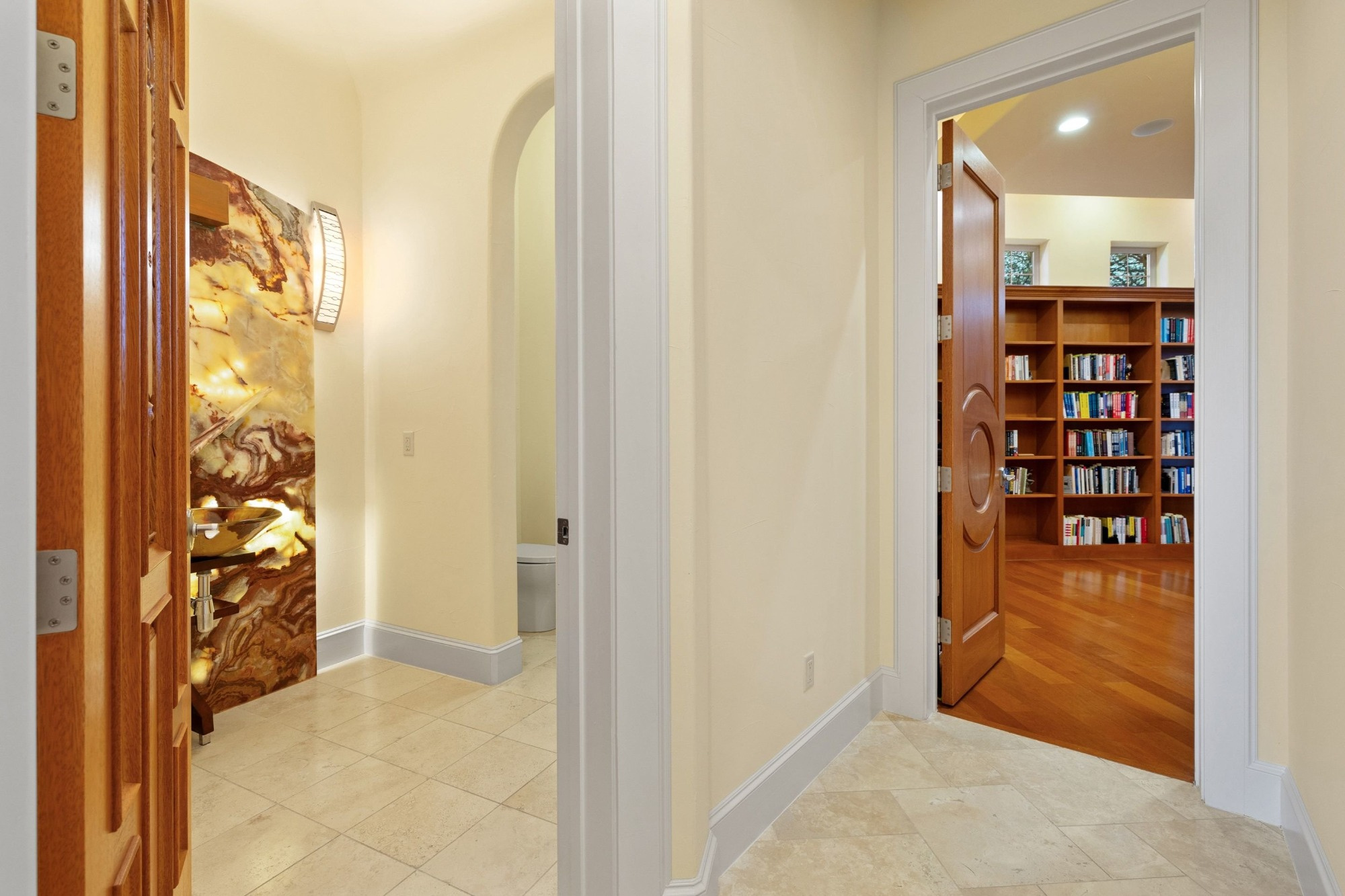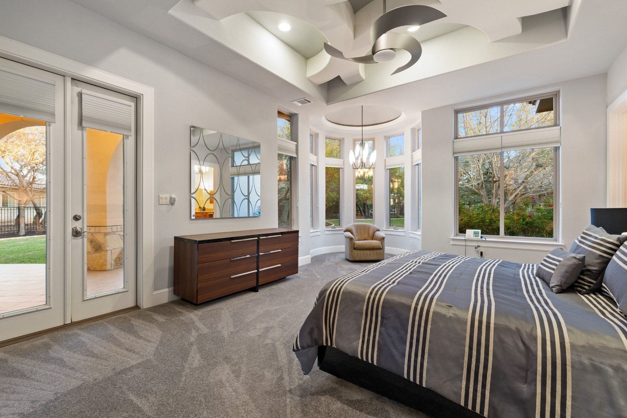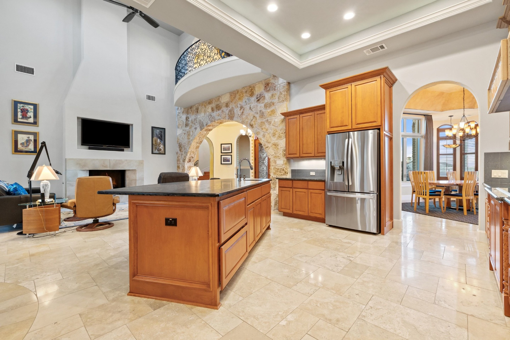 Welcome home to Mediterranean-style living at the lake. Designed by Vanguard Studios and built by Masters Touch Builders in 2012, this stone and stucco home features approximately 80 tons of stone, a Mexican concrete tile roof, and a charming courtyard with fountain. The 4,797± sq. ft. residence sits on a beautifully landscaped 0.497-acre wooded lot and offers 5 beds, 4 full baths, and 2 half baths. The main level includes a library, dining room, spacious kitchen with large pantry, breakfast area, living room with fireplace, primary suite, guest suite and laundry room. The kitchen features a tray ceiling with crown molding, recessed lighting, a 9’ x 4’ granite island with vegetable sink, granite countertops, stained wood cabinetry with deep drawers, pull-out spice racks, and specialty storage. Appliances include an LG French door refrigerator, Bosch electric cooktop, microwave, double ovens, and a Whirlpool dishwasher. The library is prewired to convert to a media room. The primary suite features a coffered ceiling, patio access, and a turret-style sitting area with domed ceiling and tall windows overlooking the rose garden. The primary bath includes a walk-in tiled shower with seating, dual vanities, air jet tub, and private commode. Upstairs, accessible by a spiral staircase or the elevator, are three additional bedrooms and a lofted party room overlooking the living room. One bedroom has an en-suite bath while two share a full bath, with lake views from many rooms including the balcony. The landscaped grounds feature towering live oaks, flowering trees, rose bushes, and space for a future pool. An all-copper lightning protection system and whole house surge protector system was installed by Hamilton Lightning Rods in April 2023.