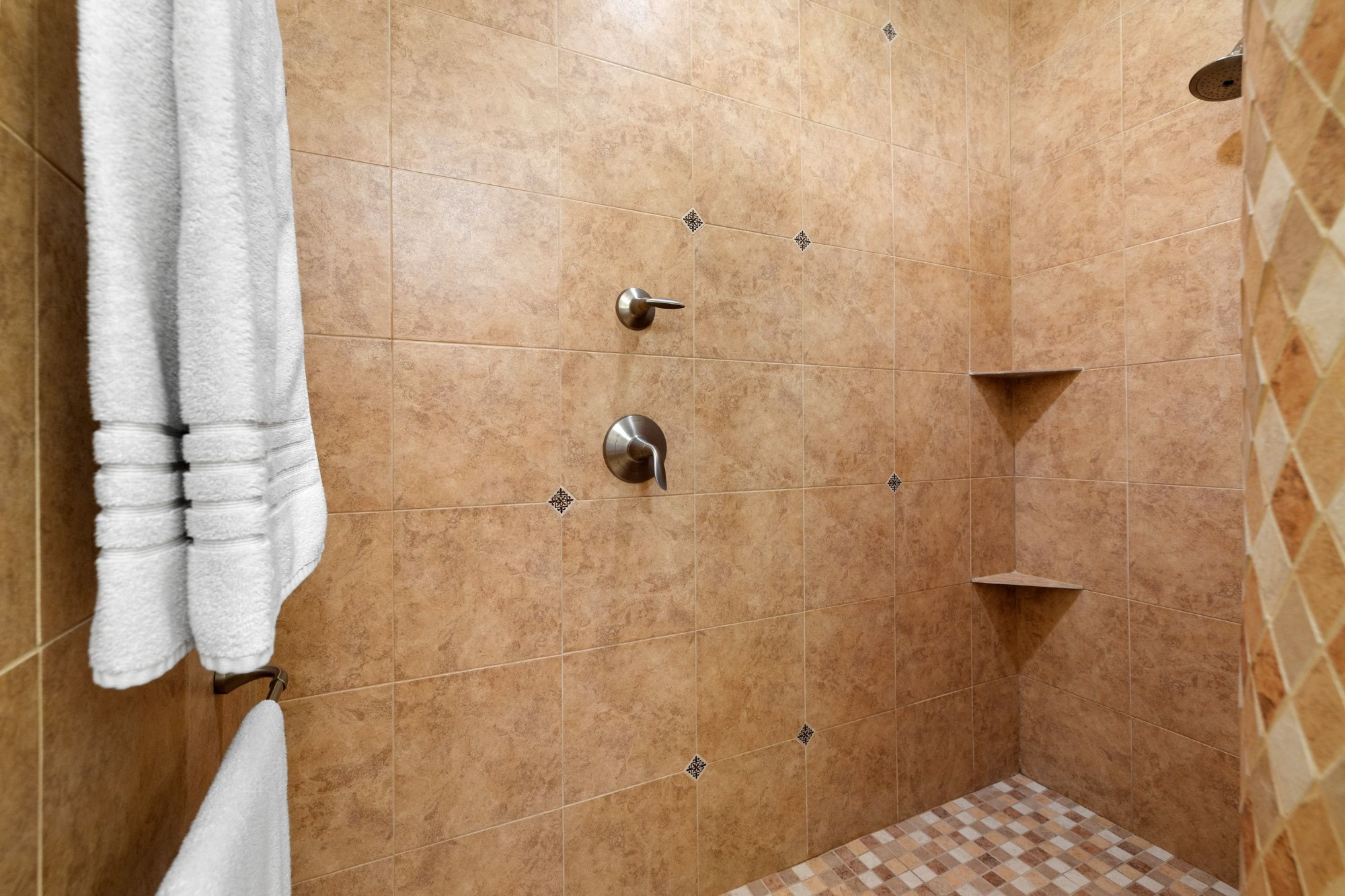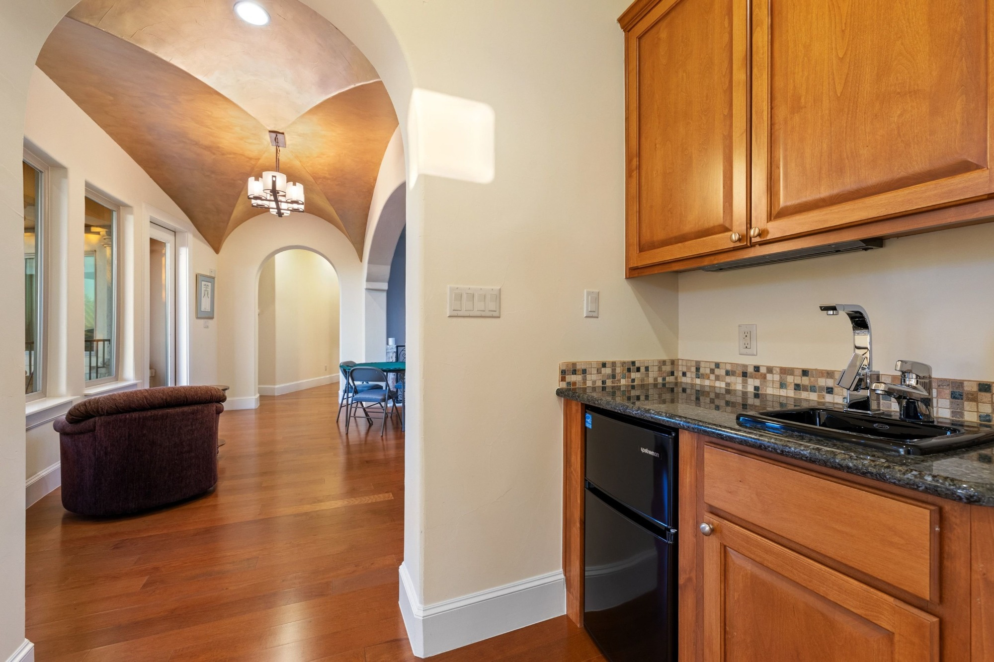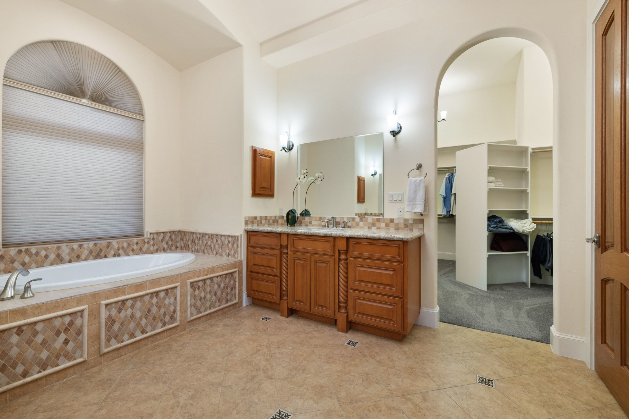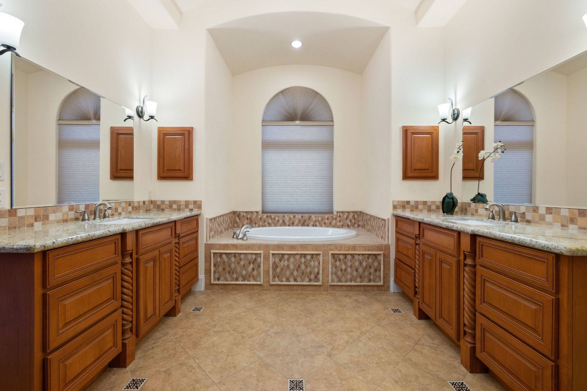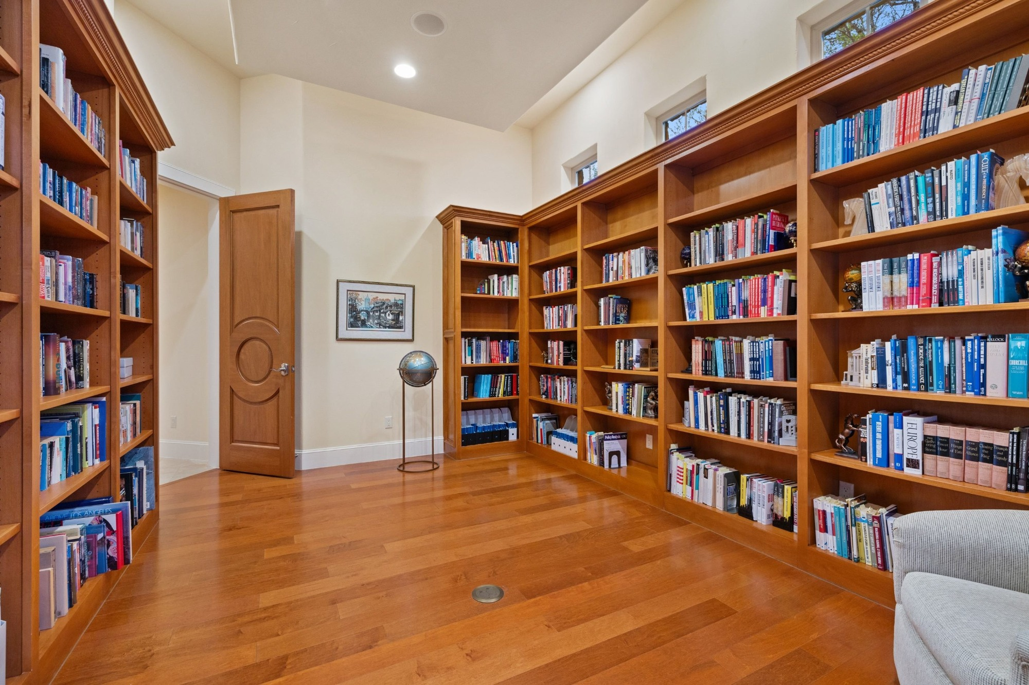 Welcome home to Mediterranean-style living at the lake. Designed by Vanguard Studios and built by Masters Touch Builders in 2012, this stone and stucco home features approximately 80 tons of stone, a Mexican concrete tile roof, and a charming courtyard with fountain. The 4,797± sq. ft. residence sits on a beautifully landscaped 0.497-acre wooded lot and offers 5 beds, 4 full baths, and 2 half baths. The main level includes a library, dining room, spacious kitchen with large pantry, breakfast area, living room with fireplace, primary suite, guest suite and laundry room. The kitchen features a tray ceiling with crown molding, recessed lighting, a 9’ x 4’ granite island with vegetable sink, granite countertops, stained wood cabinetry with deep drawers, pull-out spice racks, and specialty storage. Appliances include an LG French door refrigerator, Bosch electric cooktop, microwave, double ovens, and a Whirlpool dishwasher. The library is prewired to convert to a media room. The primary suite features a coffered ceiling, patio access, and a turret-style sitting area with domed ceiling and tall windows overlooking the rose garden. The primary bath includes a walk-in tiled shower with seating, dual vanities, air jet tub, and private commode. Upstairs, accessible by a spiral staircase or the elevator, are three additional bedrooms and a lofted party room overlooking the living room. One bedroom has an en-suite bath while two share a full bath, with lake views from many rooms including the balcony. The landscaped grounds feature towering live oaks, flowering trees, rose bushes, and space for a future pool. An all-copper lightning protection system and whole house surge protector system was installed by Hamilton Lightning Rods in April 2023.