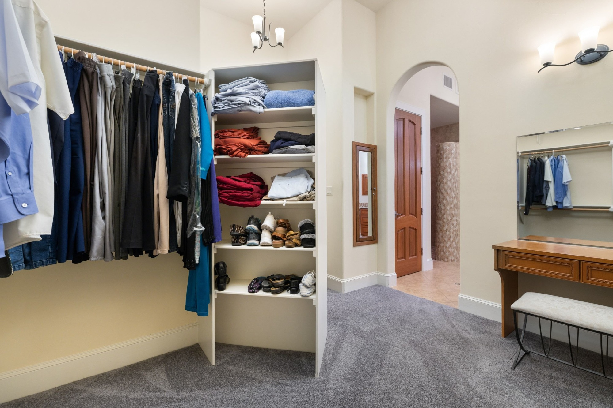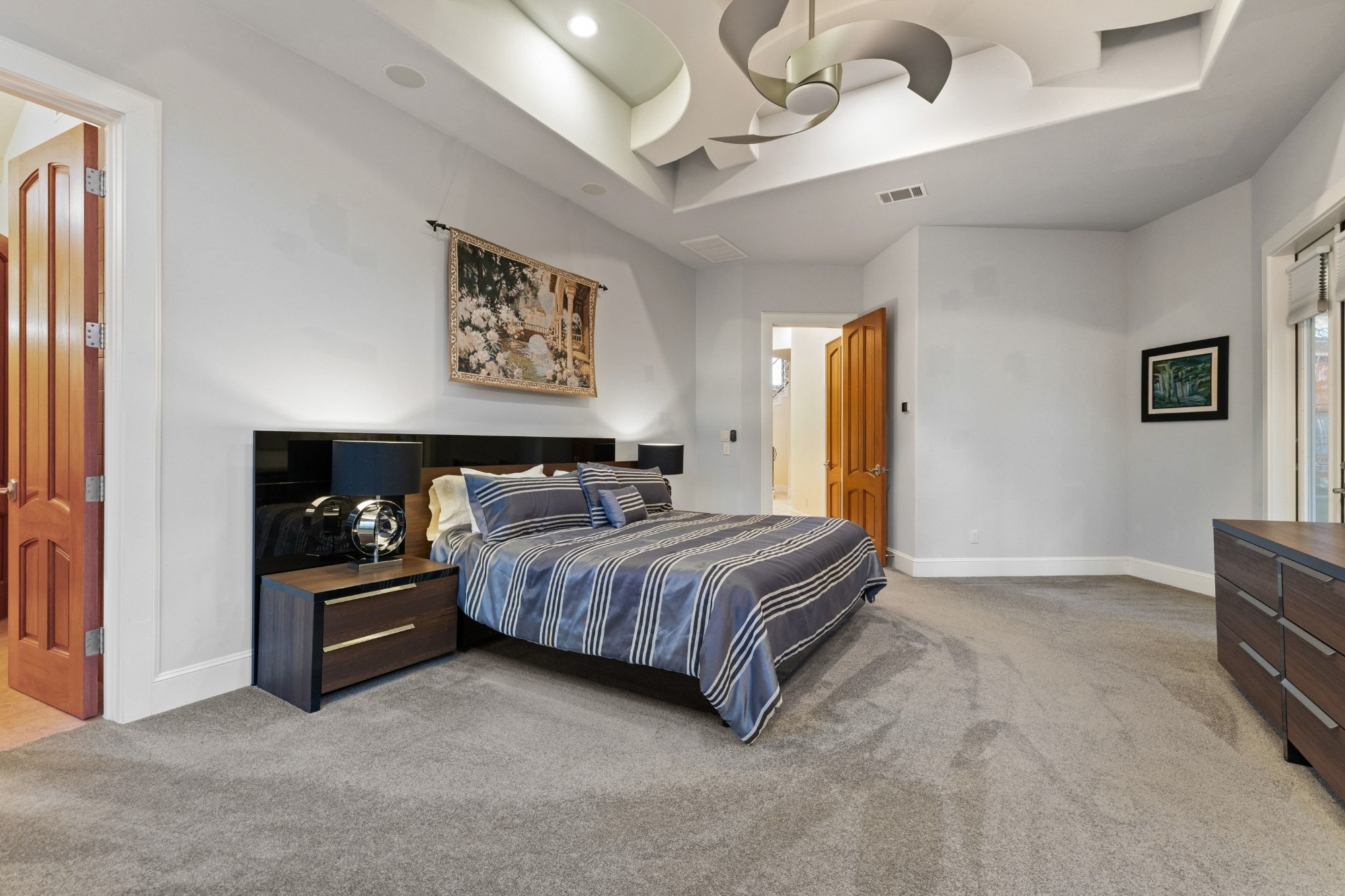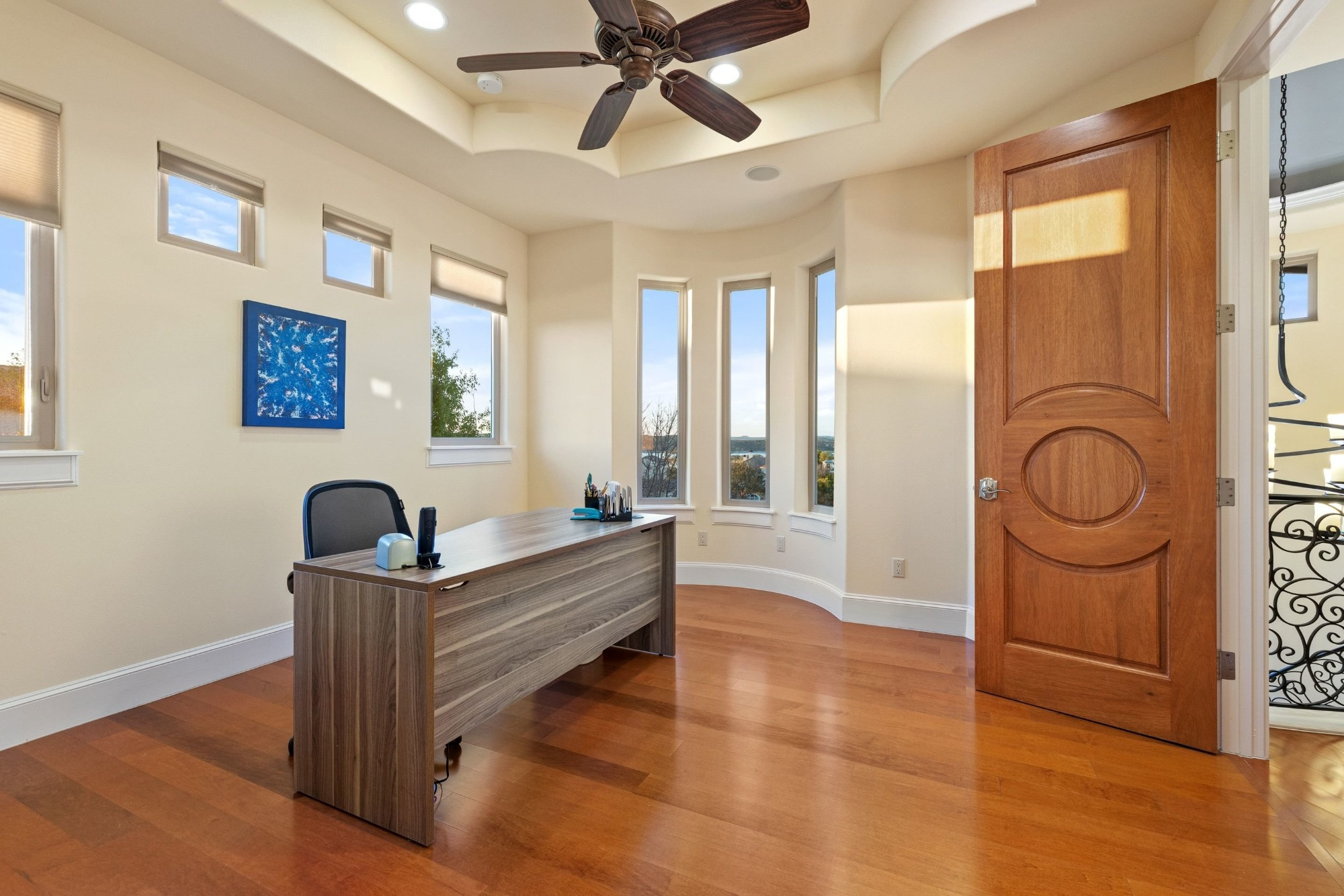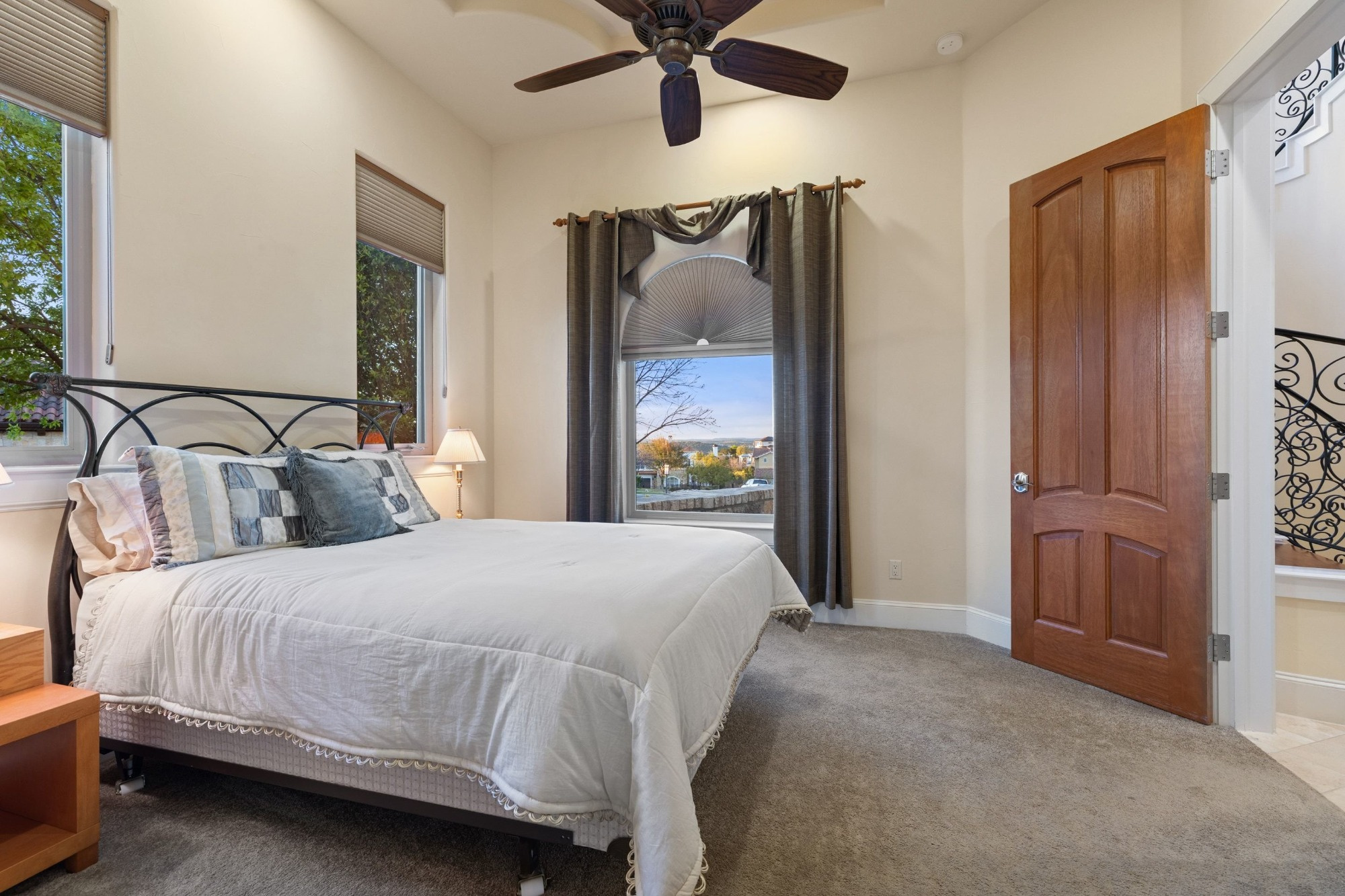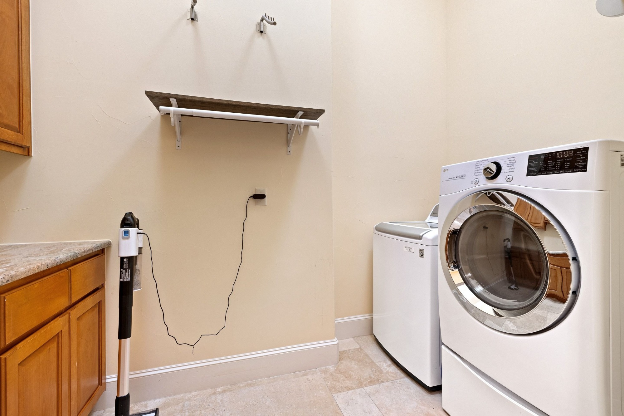 Welcome home to Mediterranean-style living at the lake. Designed by Vanguard Studios and built by Masters Touch Builders in 2012, this stone and stucco home features approximately 80 tons of stone, a Mexican concrete tile roof, and a charming courtyard with fountain. The 4,797± sq. ft. residence sits on a beautifully landscaped 0.497-acre wooded lot and offers 5 beds, 4 full baths, and 2 half baths. The main level includes a library, dining room, spacious kitchen with large pantry, breakfast area, living room with fireplace, primary suite, guest suite and laundry room. The kitchen features a tray ceiling with crown molding, recessed lighting, a 9’ x 4’ granite island with vegetable sink, granite countertops, stained wood cabinetry with deep drawers, pull-out spice racks, and specialty storage. Appliances include an LG French door refrigerator, Bosch electric cooktop, microwave, double ovens, and a Whirlpool dishwasher. The library is prewired to convert to a media room. The primary suite features a coffered ceiling, patio access, and a turret-style sitting area with domed ceiling and tall windows overlooking the rose garden. The primary bath includes a walk-in tiled shower with seating, dual vanities, air jet tub, and private commode. Upstairs, accessible by a spiral staircase or the elevator, are three additional bedrooms and a lofted party room overlooking the living room. One bedroom has an en-suite bath while two share a full bath, with lake views from many rooms including the balcony. The landscaped grounds feature towering live oaks, flowering trees, rose bushes, and space for a future pool. An all-copper lightning protection system and whole house surge protector system was installed by Hamilton Lightning Rods in April 2023.