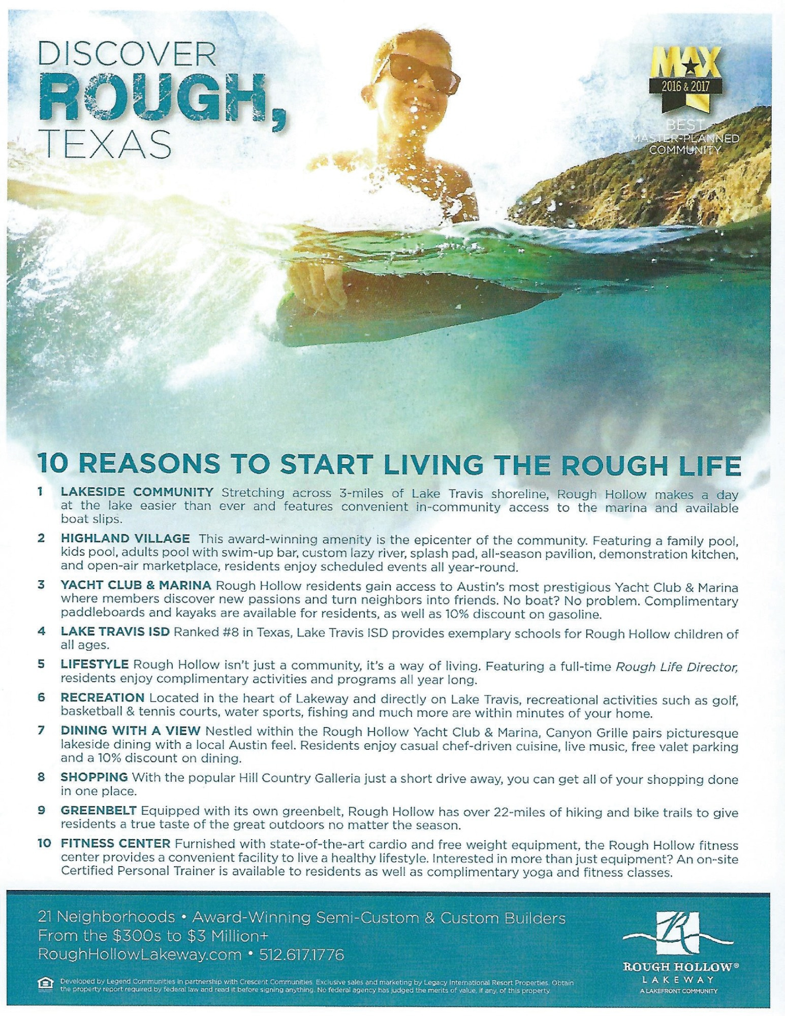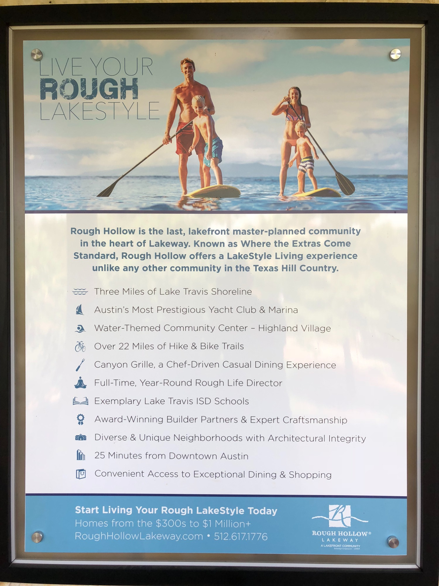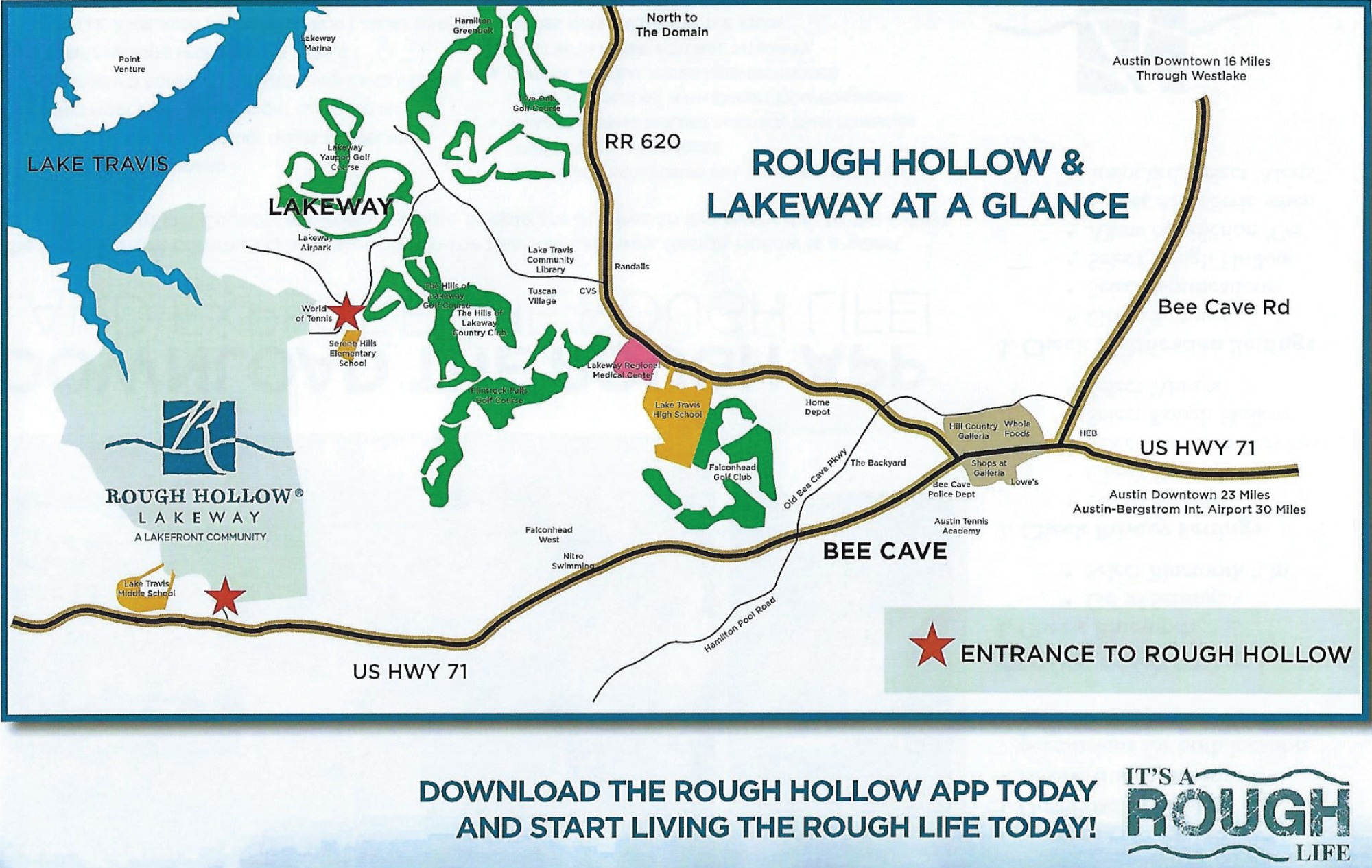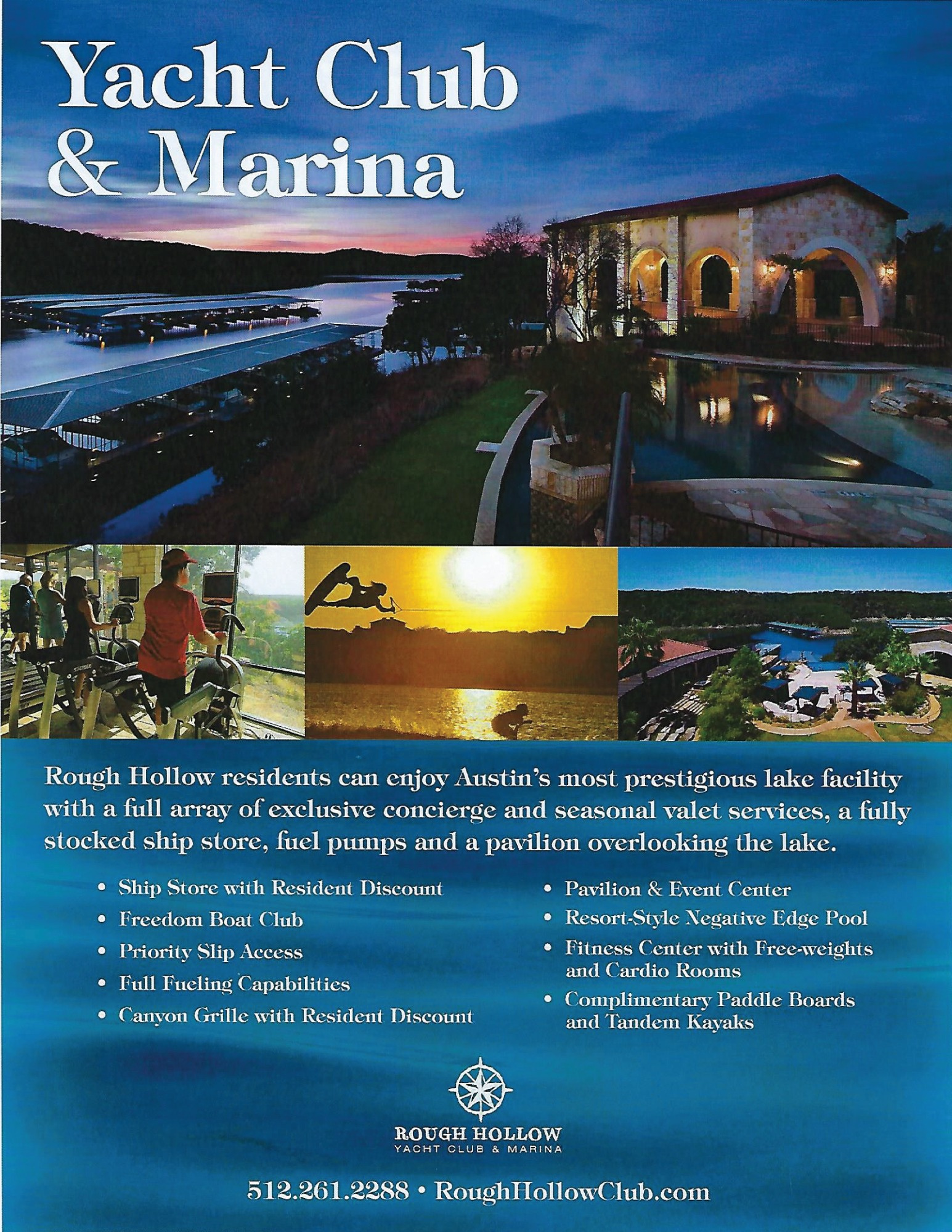 The location is just 30 minutes from downtown Austin you will find The Enclave at Rough Hollow - a resort style community on the prestigious South shore of Lake Travis. Featuring direct lake access, breathtaking Hill Country views and world-class amenities such as the Rough Hollow Yacht Club and Marina (Mandatory $94/month on top of the $2,200 annual HOA fee), Canyon Grille, miles of hike and bike trails, luxurious pools, gym, pavilion & Highland Village: a water-themed amenities center. Rough Hollow offers an unparalleled lakeside lifestyle close to dining, shopping, golf & tennis. It's all here waiting for you to come live the "Rough Life.”